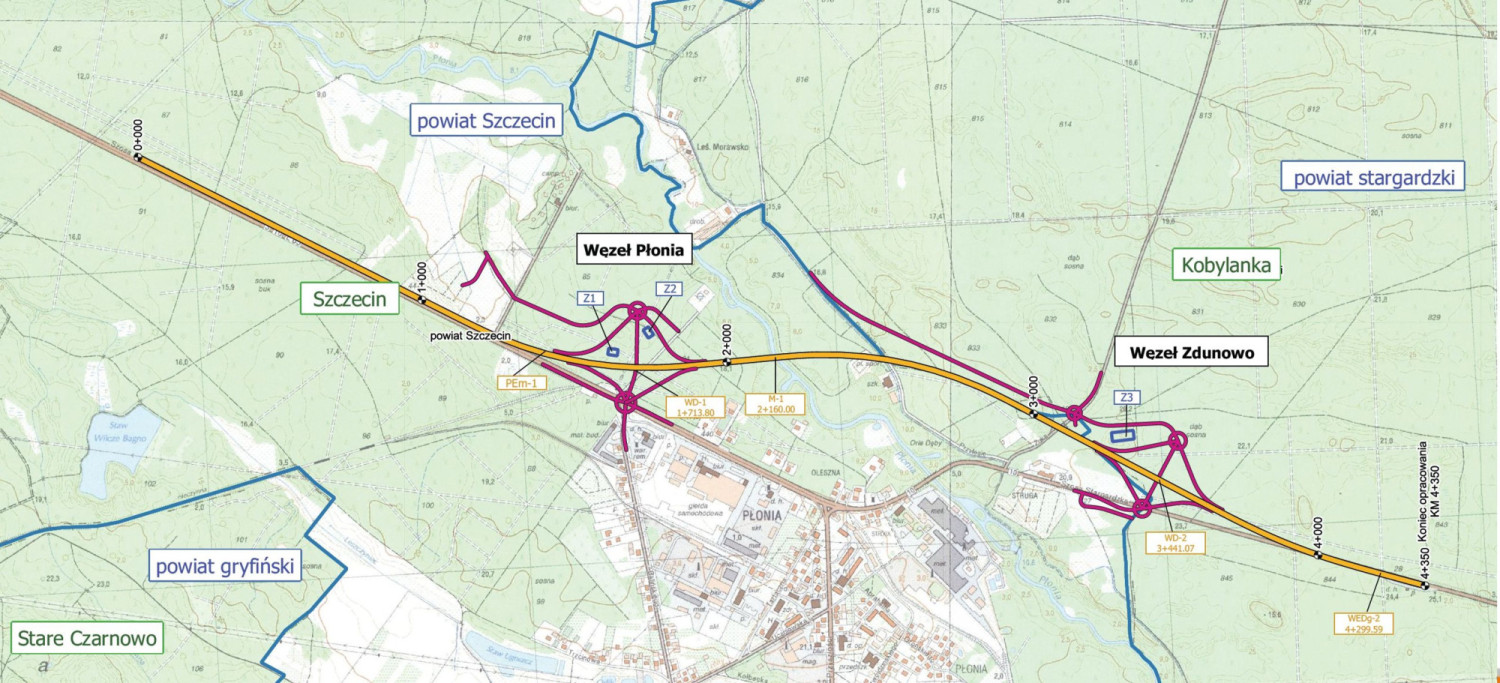 Omawiany odcinek połączy dwa nowe węzły: Płonia i Zdunowo. Zacznie się węzłem Kijewo i stacją paliw przy ul. Szosa Stargardzka. Nad rzeką Płonia zostanie wybudowany nowy most, zaplanowano też dwa wiadukty i trzy przejścia dla zwierząt, w tym dwa górne dla zwierząt dużych.