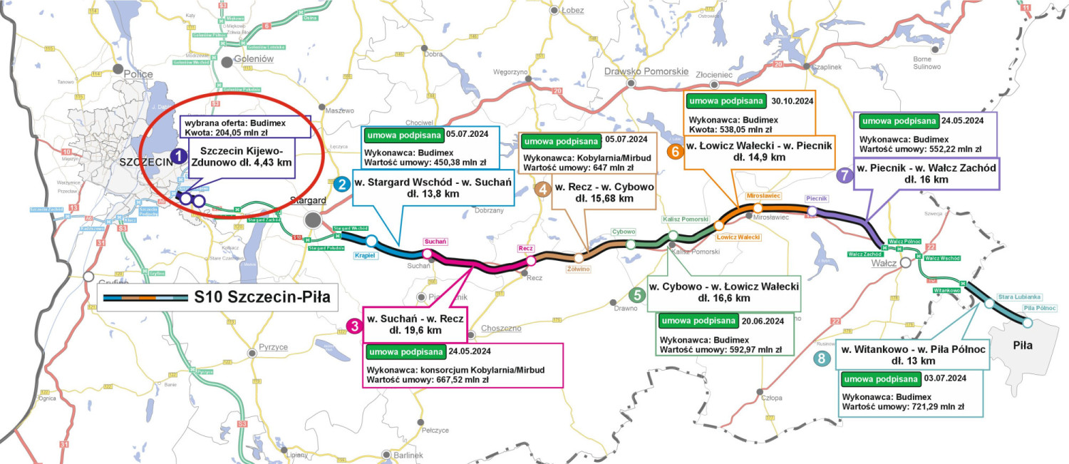 Wtedy mają być gotowe wszystkie fragmenty S10 między Szczecinem a Piłą. Sześć z nich zbuduje Budimex (Szczecin Kijewo – Szczecin Zdunowo, Stargard – Suchań, Cybowo – Łowicz Wałeckie, Łowicz Wałecki – Piecnik, Piecnik – Wałcz, Wałcz – Piła), a dwa konsorcjum Kobylarnia i Mirbud (Suchań – Recz, Rech – Cybowo). Łącznie to 113 kilometrów dróg, których budowa pochłonie 4,4 mld zł.