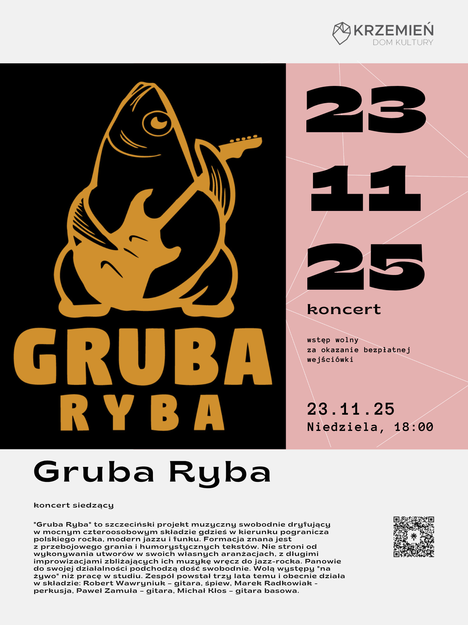 „Gruba Ryba" to szczeciński projekt muzyczny swobodnie dryfujący w mocnym czteroosobowym składzie gdzieś w kierunku pogranicza polskiego rocka, modern jazzu i funku.