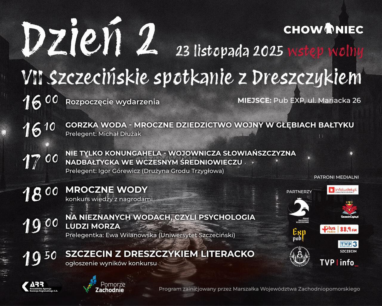 Oprócz prelekcji i spotkań z pasjonatami i specjalistami z dziedzin historii, regionoznawstwa czy psychologii będziecie mogli wziąć udział w warsztatach rękodzielniczych oraz zakupić mroczną literaturę tworzoną przez szczecinianki i szczecinian. Pod koniec wydarzenia poznamy również laureatki lub laureatów konkursu „Szczecin z dreszczykiem literacko”.
