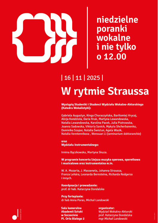 Koncert inaugurujący czwarty sezon poranków zatytułowany został „W rytmie Straussa”, jako że ledwie przed trzema tygodniami (25 października) świętowaliśmy rocznicę 200-lecia urodzin wiedeńskiego króla operetki. Koncert odbędzie się w dniu 16 listopada 2025 r., jak zawsze w samo południe w Sali Kameralnej Pałacu pod Globusem w Akademii Sztuki w Szczecinie.