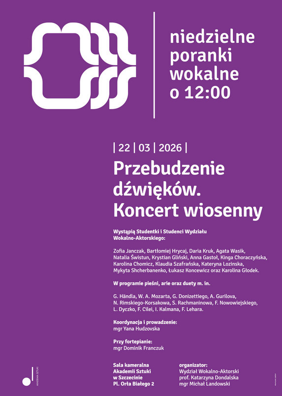 Startuje czwarty sezon Niedzielnych poranków wokalnych o 12.00 w Akademii Sztuki w Szczecinie, autorskiego projektu prof. dr hab. Katarzyny Dondalskiej przy współpracy z mgr Michałem Landowskim, organizowanego przez Wydział Wokalny Akademii Sztuki w Szczecinie.