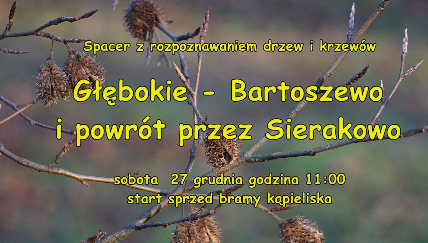 Paweł Madejski zaprasza na ostatni w 2025 roku, spacer z rozpoznawaniem drzew i krzewów. Tym razem, dodatkowym celem spaceru, będzie również pozbycie się, choć części kalorii, odkładających się przy okazji każdych kolejnych świąt. Długa trasa spaceru, jak każdego prawie roku zimą, wiedzie od bramy na kąpielisko Głębokie, północną stroną jeziora i dalej do Bartoszewa. Tam przewidujemy chwilowy odpoczynek, jakiś gorący napój i powrót trasą prowadzącą przez Sierakowo. Cała trasa powinna zmieścić się w 13-15 kilometrach, około 2,5 do 3 godzin marszu.