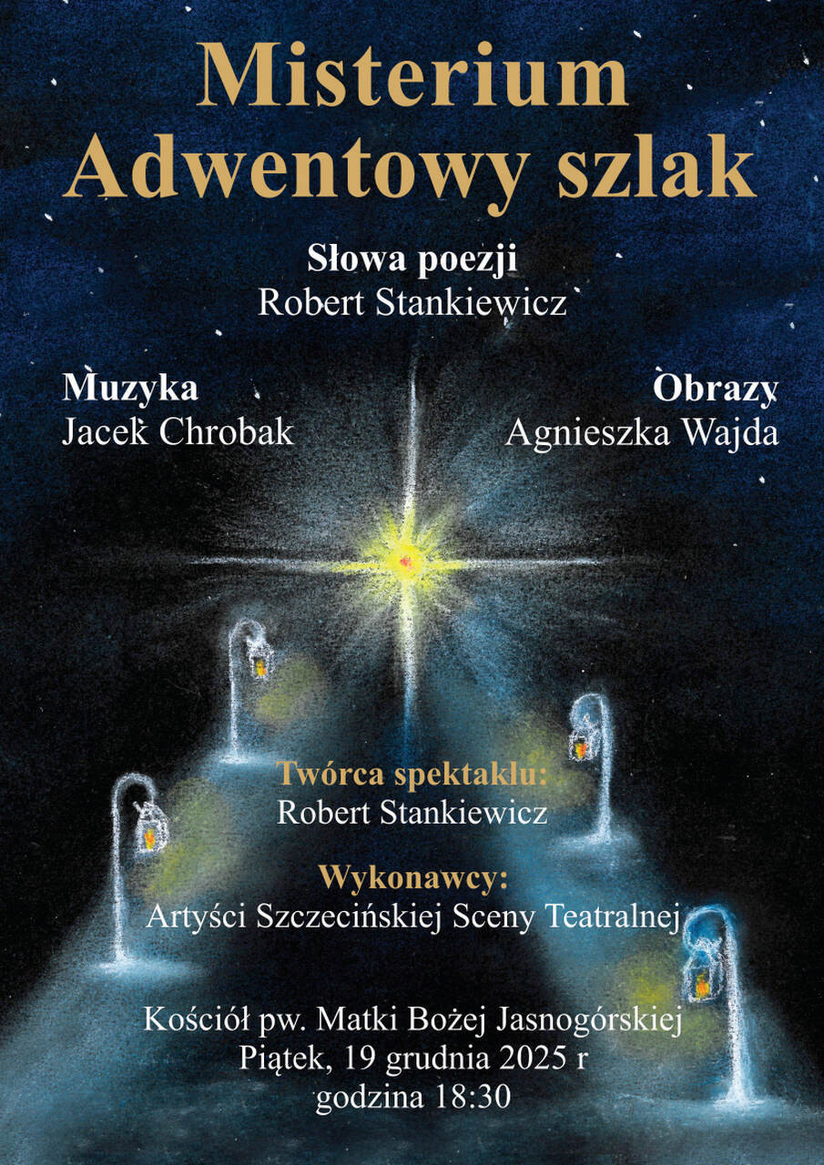 Organizatorzy zapraszają na wyjątkowy spektakl audiowizualny z cyklu Słowo – Muzyka – Obraz „Misterium – adwentowy szlak” autorstwa Roberta Stankiewicza, do muzyki Jacka Chrobaka i obrazów Agnieszki Wajdy w wykonaniu Artystów Szczecińskiej Sceny Teatralnej.