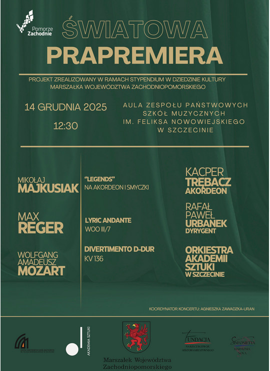 Akademia Sztuki zaprasza serdecznie na koncert, podczas którego po raz pierwszy zabrzmi Suita Szczecińska „Legends” — kompozycja na akordeon i orkiestrę smyczkową, muzycznie interpretująca pięć legend Szczecina.