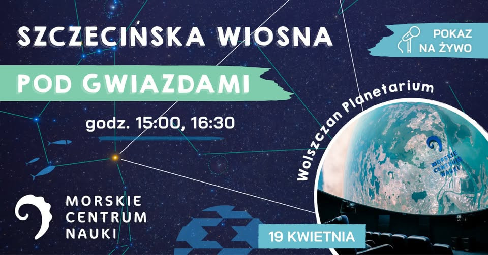 Morskie Centrum Nauki zaprasza pokaz planetaryjny „Szczecińska wiosna pod gwiazdami” – spacer po najjaśniejszych gwiazdach i spektakularnych zjawiskach dostępnych na nocnym niebie, w formie prezentacji.
