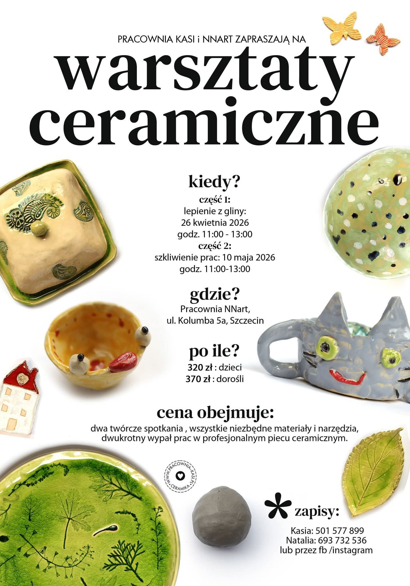 Cena obejmuje: dwa twórcze spotkania , wszystkie niezbędne materiały i narzędzia, dwukrotny wypał prac w profesjonalnym piecu ceramicznym.