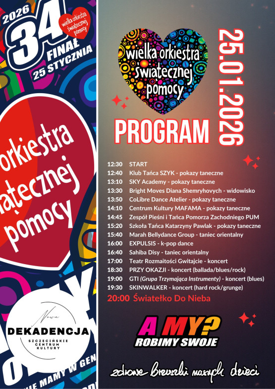 Do wspólnego grania z WOŚP zachęca także CH Galaxy. W niedzielę od 12:00 do 20:00 w centrum handlowym organizowane będą aukcje, koncerty i licytacje, które wzbudzają duże emocje. Na scenie pojawią się m.in. mistrzowie świata w tańcu towarzyskim Julia Tuchewicz i Kamil Mecha oraz freestyle footballer Dominik Bartoszewicz. Zaplanowano kiermasz książek, pokaz motocykli, liczne warsztaty i eksperymenty dla dzieci, zabawy z policjantami, bezpłatne badania. O godz. 20:00 wolontariusze zapraszają na Światełko do nieba i wspólne zatańczenie poloneza. Szczegółowy harmonogram: https://www.galaxy-centrum.pl/aktualnosci/final-wosp-2026-w-galaxy-gramy-dla-szczecina