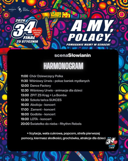 W Słowianinie przez cały dzień (godz. 11-20) zaplanowano występy artystyczne, animacje oraz liczne licytacje i koncerty. Na kultowej scenie zagrają Abolicja, Godbite, Lota oraz Zament. Wystąpią także Zespół Pieśni i Tańca Ziemi Szczecińskiej „Krąg” oraz La’Bomba. Nie zabraknie również waty cukrowej, popcornu, kiermaszu słodkości i atrakcji dla dzieci. Więcej: https://slowianin.org/event/34-final-wosp/