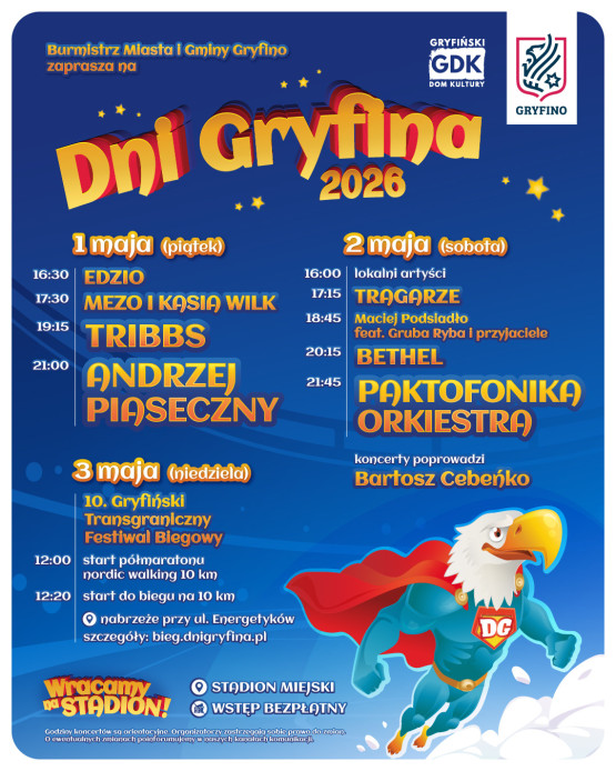 Start tegorocznych Dni Gryfina już w piątek, 1 maja. Tego dnia na scenie wystąpią charyzmatyczny freestyle'owiec i raper Edzio, którego profil na TikToku śledzi ponad 2 mln fanów oraz jeden z najpopularniejszych polskich raperów – Mezo, któremu na scenie będzie towarzyszyła Kasia Wilk. „To będzie wyjątkowy koncert, który połączy muzykę obu artystów w barwne i pełne energii widowisko!” – zapowiadają organizatorzy.