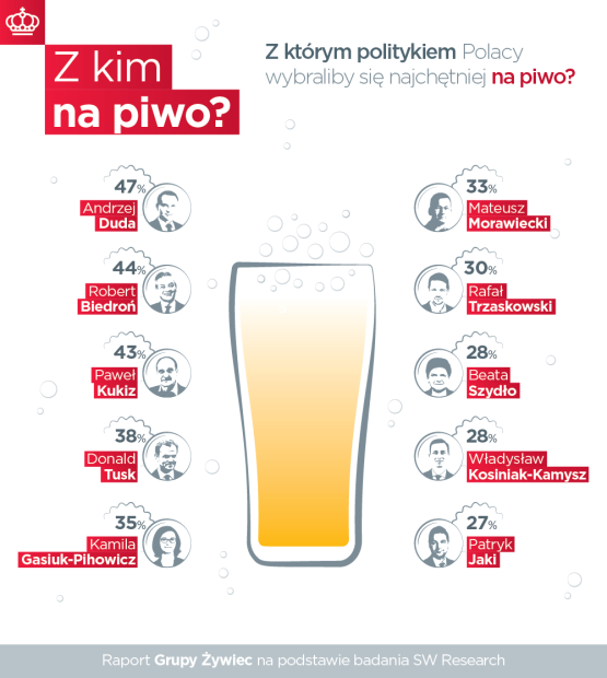 Ogólnopolskie badanie „Z kim na piwo?” przeprowadzono już po raz trzeci. W tegorocznej edycji pierwsze miejsce zajął Prezydent Andrzej Duda, którego wskazało 47 proc. respondentów. Na drugiej pozycji znalazł się Robert Biedroń, prezydent Słupska, którego tym razem wybrało 44 proc. badanych. Paweł Kukiz, lider Kukiz 15, znalazł się na miejscu trzecim z 43 proc. głosów. Przewodniczący Rady Europejskiej Donald Tusk uplasował się na czwartej pozycji zdobywając 38 proc. głosów, natomiast na piątym miejscu zadebiutowała Kamila Gasiuk-Pihowicz. Posłanka Nowoczesnej zdobyła 35 proc. głosów i jako pierwsza kobieta ze świata polityki pojawiła się w czołówce osób, z którymi Polacy najchętniej wybraliby się na piwo.