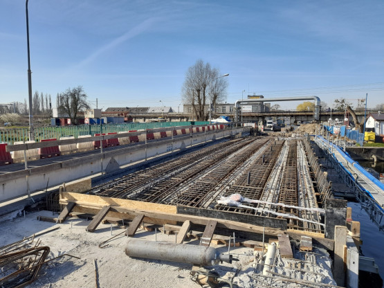 – Zakończono połówkowy montaż belek 12 belek prefabrykowanych o łącznej macie ponad 104 ton. Do końca marca wbudowano też ponad 17 ton zbrojenia przęseł. Obecnie trwa montaż zbrojenia podpór oraz betonowanie płyty pomostu etapu I. Do wbudowania około 135 m3 betonu. Przypominamy, że w ramach prac wymieniany jest ustrój nośny z wykorzystaniem istniejących podpór – mówi Hanna Pieczyńska.
