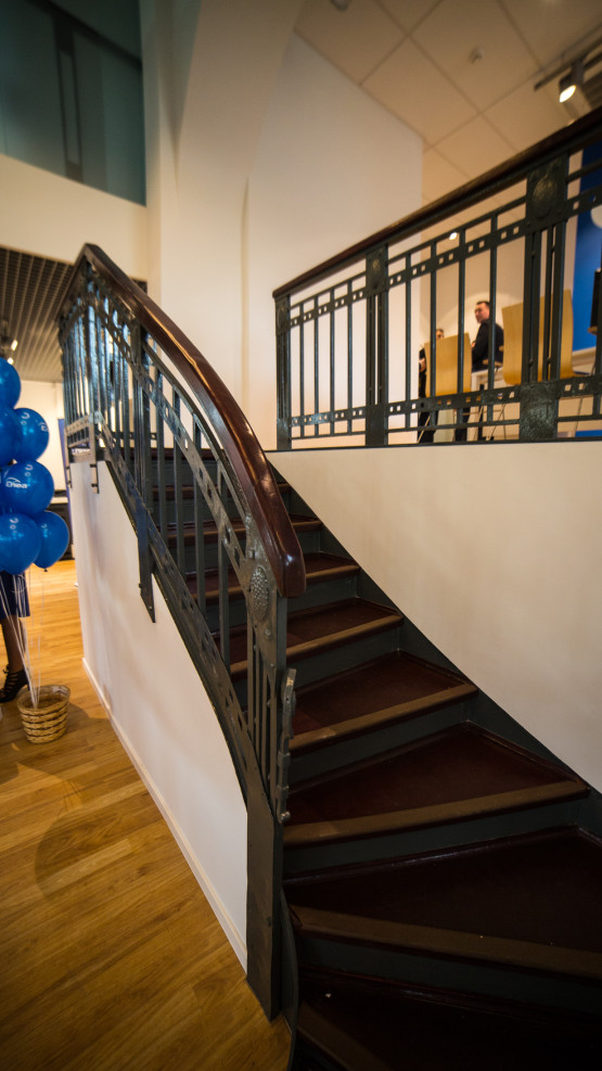 We wnętrzu budynku niewiele się zachowało z dawnego wyposażenia. To, co każdy może obejrzeć to oryginalna balustrada schodów oraz łuk sklepienia dzielący przestrzeń na parterze. W ramach modernizacji obiektu zagospodarowano również teren wokół budynku, gdzie powstał m.in. parking dla klientów firmy.