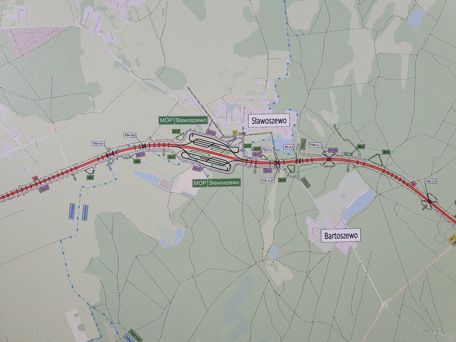 Dalej nowa S6 przejdzie między miejscowościami Sławoszewo i Bartoszewo. Na południe od tej pierwszej miejscowości będzie zlokalizowane Miejsce Obsługi Podróżnych (MOP) Sławoszewo.