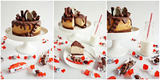 Spełnienie dziecięcych marzeń każdego sernikożercy. Jedwabisty, kremowy, rozpuszczający się pod podniebieniem sernik, polany mleczną czekoladą i obłożony wspaniałościami z rodziny Kinder. Słodka niespodzianka dla całej rodziny – nie tylko na Wielkanoc.