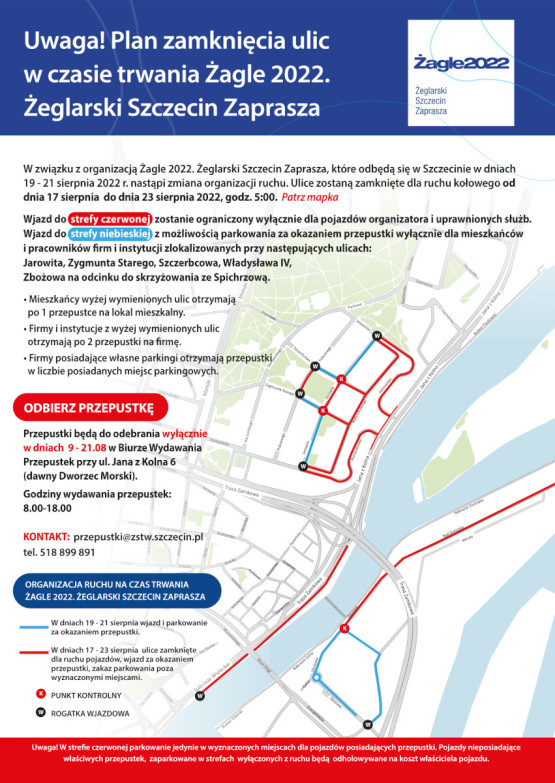 – Przepustki będą do odebrania wyłącznie w dniach 9-21.08 w Biurze Wydawania Przepustek przy ulicy Jana z Kolna 6 w godzinach 8-18. W celu ustalenia szczegółów odbioru przepustek można również skontaktować się mailowo pod adresem przepustki@zstw.szczecin.pl oraz telefonicznie – od 9 sierpnia – pod numerem 518 899 891 – informuje Andrzej Kus, rzecznik prasowy miejskiej spółki Żegluga Szczecińska Turystyka Wydarzenia.