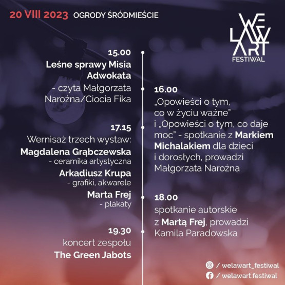 „We Law Art” to pierwszy festiwal łączący sztukę i prawo w Polsce. Pierwsza edycja odbędzie się w niedzielę w urokliwych Ogrodach Śródmieście przy ul. Wielkopolskiej 19. W programie m.in. aż trzy wernisaże, spotkania autorskie z Martą Frej i Markiem Michalakiem, czytanki dla dzieci, koncert zespołu The Green Jabots. Wydarzenie w godz. 15:00-20:30. Wstęp wolny. Więcej: https://www.facebook.com/events/995268368157461/?active_tab=discussion