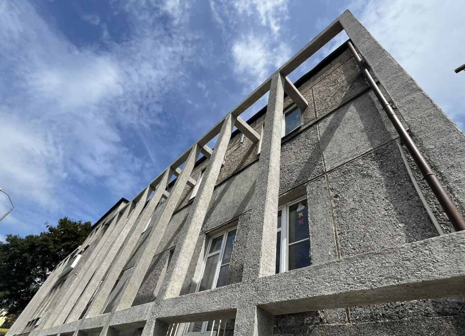 Ryglowa konstrukcja elewacji modernistycznego budynku wymagała rozbiórki, rekonstrukcji i odtworzenia historycznej wyprawy tynkowej. Prace realizowane były pod nadzorem miejskiego konserwatora zabytków Michała Dębowskiego.