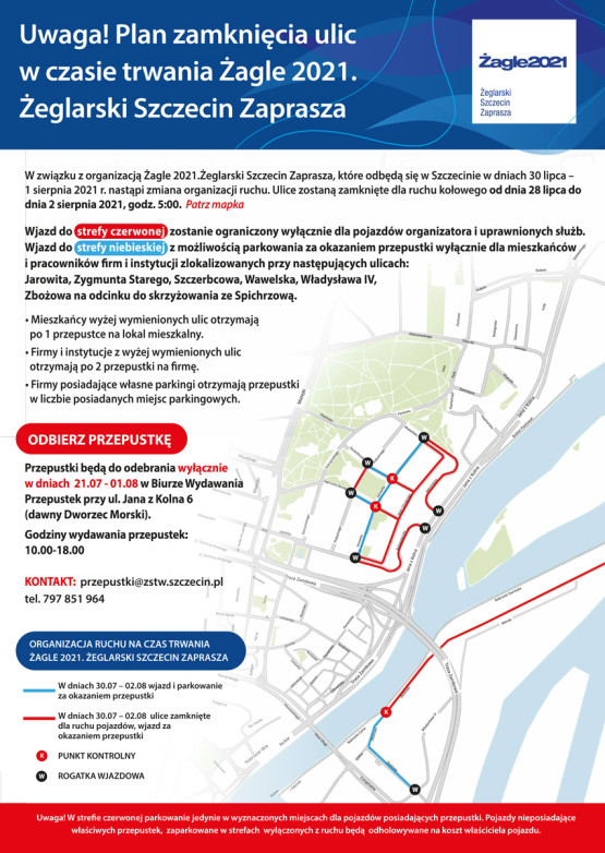 Ruch na ul. Jana z Kolna zostanie zachowany, ale na odcinku w rejonie Wałów Chrobrego (od ul. Kapitańskiej do Trasy Zamkowej) wprowadzone będzie ograniczenie do 30 km/h. Normalnie kursować będą tramwaje linii 6. Zamknięta zostanie natomiast część okolicznych ulic. Ich mieszkańcy od środy, 21 lipca, będą mogli odbierać specjalne wjazdówki, umożliwiające im dojazd do swoich posesji. Biuro Przepustek będzie działać przy ul. Jana z Kolna 6, w godzinach 10:00 - 18:00. Szczegółowe informacje dotyczące organizacji ruchu i komunikacji miejskiej można znaleźć w poniższym komunikacie organizatora – miejskiej spółki Żegluga Szczecińska Turystyka Wydarzenia.