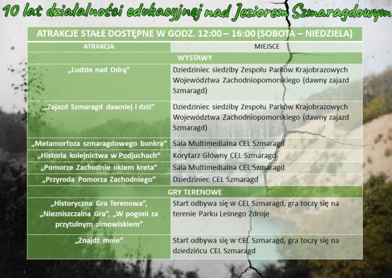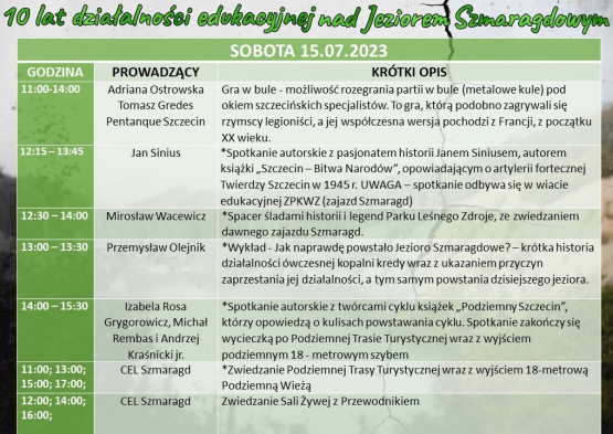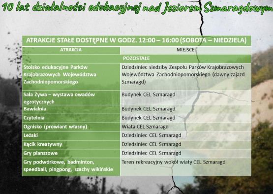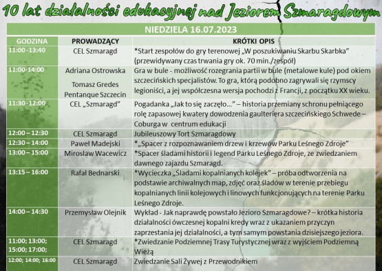 Jak zapowiadają organizatorzy, urodziny Jeziora Szmaragdowego „będą huczne”. O atrakcje dla gości zadbali Centrum Edukacji Leśnej Szmaragd i Szczecińskie Stowarzyszenie Przygodowe „Za Horyzont” przy współudziale Zespołu Parków Krajobrazowych Województwa Zachodniopomorskiego.