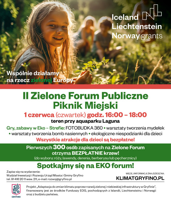 Piknik miejski „Zielone forum publiczne” organizowany jest w ramach projektu „Adaptacja do zmian klimatu poprzez rozwój zielonej i niebieskiej infrastruktury w Gryfinie”. Projekt finansowany ze środków Funduszy EOG, pochodzących z Islandii, Liechtensteinu i Norwegii oraz z budżetu państwa.