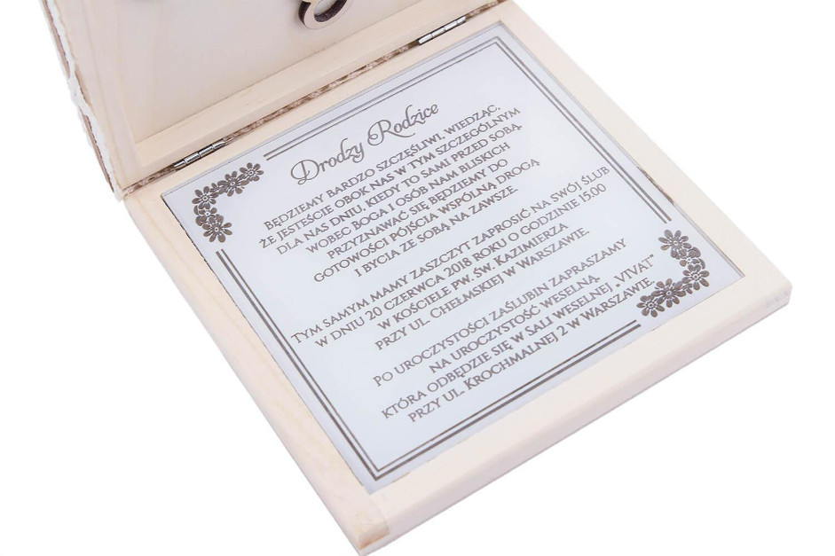 Krótka odpowiedź: tak, i to bardzo dobry. Zaproszenia w drewnianej szkatułce robią zupełnie inne wrażenie niż te w kopercie. Sam moment otwarcia wieczka buduje napięcie: rodzic podnosi je, widzi grawer z Waszymi imionami, a w środku czeka dedykacja wydrukowana na ozdobnym papierze.