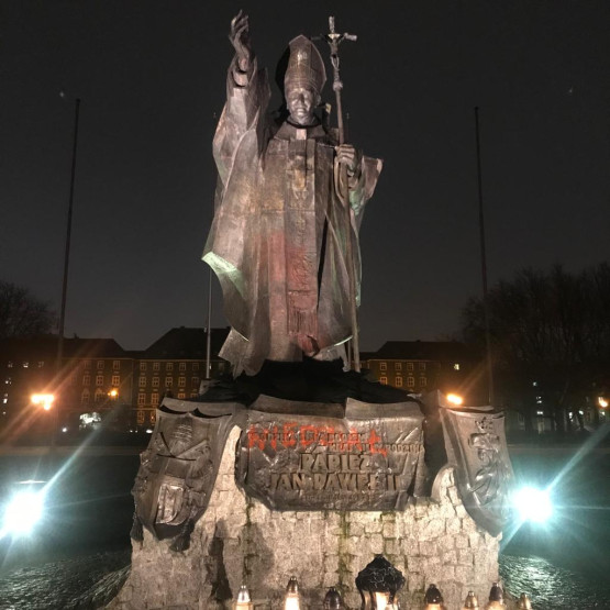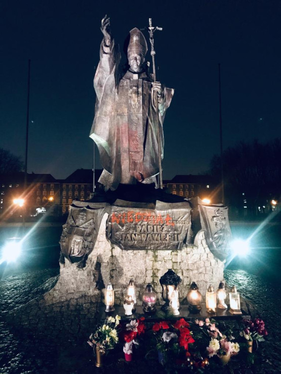 Na pomniku pojawił się napis „Wiedział”, ale farbę widać również na postaci papieża. Sprawą zajmuje się już policja. Mundurowi obecni byli przy pomniku po godzinie 11:30.
