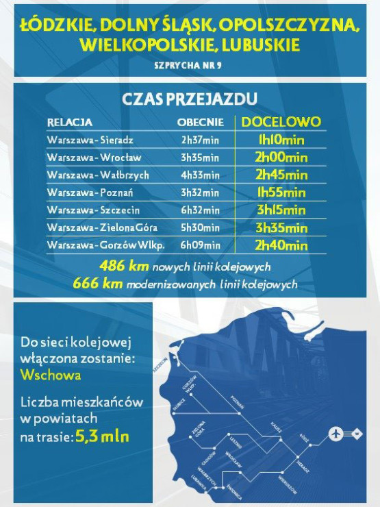 Nas najbardziej interesuje szprycha nr 9, a dokładnie jej fragment biegnący do Szczecina. Z Warszawy, przez Łódź, Sieradz, Kalisz i Poznań. Nowa infrastruktura ma pozwolić na dojechanie do stolicy w 3h i 15 min. Ma być to możliwe w „horyzoncie czasowym do 2040 r.”.