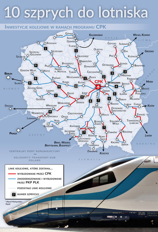 CPK to węzeł transportowy planowany między Warszawą a Łodzią. Jego koncepcja zakłada budowę lotniska, które będzie posiadać dogodne połączenie kolejowe ze stolicą i wszystkimi dużymi miastami. Zapewnić ma to modernizacja istniejącej infrastruktury i budowa 1600 km nowych linii w ramach 10 tzw. kolejowych szprych, które rozchodzić będą się z CPK we wszystkie strony kraju.