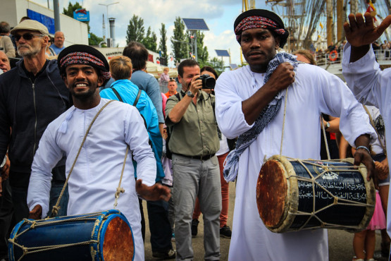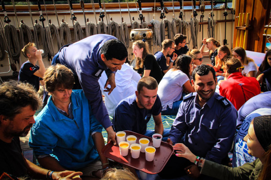Blisko setka gości – przede wszystkim załogantów z innych żaglowców, w kilkuosobowych grupach, usiadła na rozłożonych na pokładzie dywanach. W każdej grupie znajdował się przedstawiciel gospodarzy, który opowiadał na temat tradycyjnych smakołyków, które tego dnia oferowali. Po tym, jak członkowie jednostki Shabab Oman II przynieśli na tacach przysmaki – rozpoczęła się uczta.