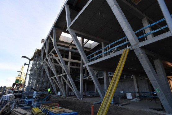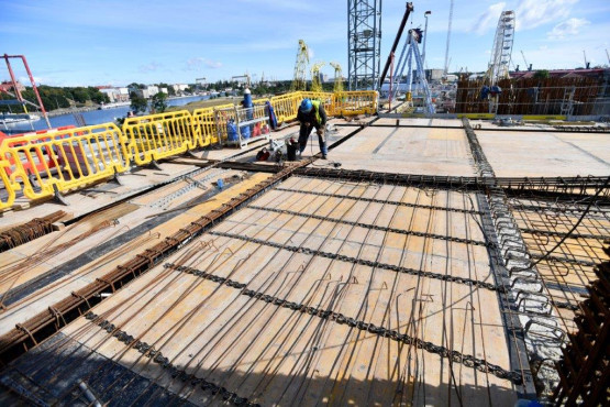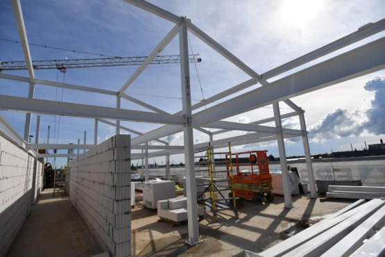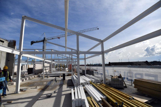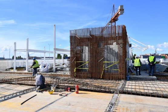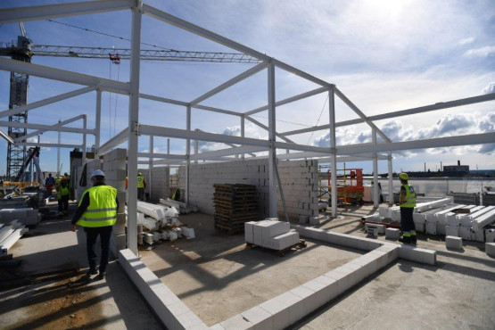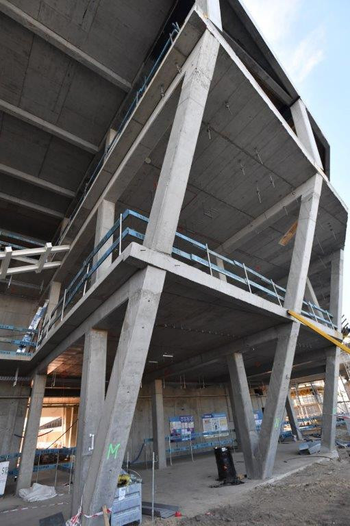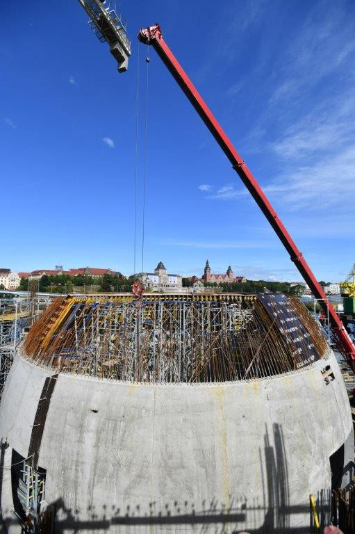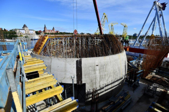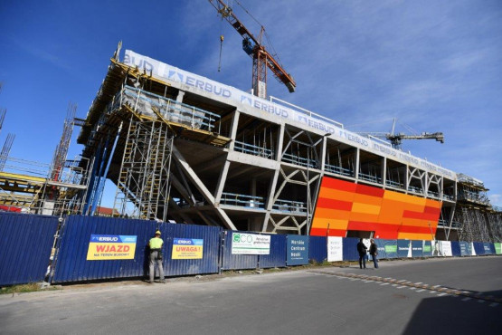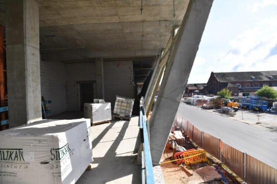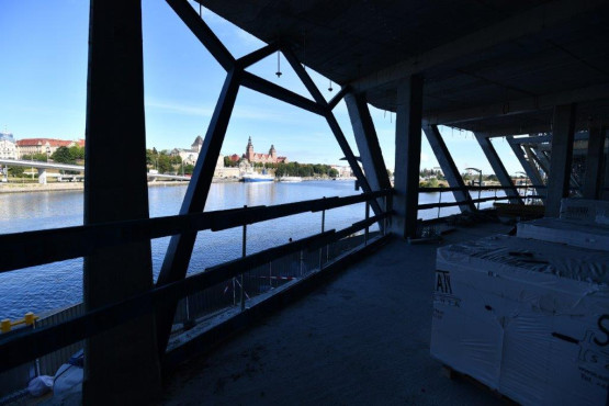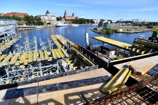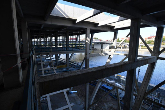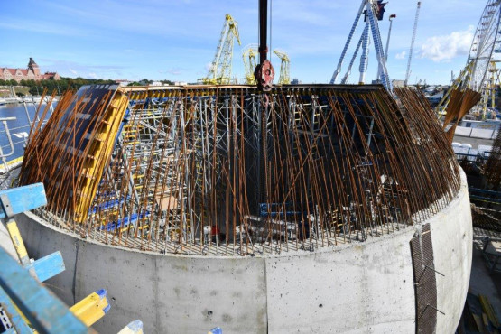 – Układane jest zbrojenie słupów pionowych oraz skośnych, które stanowią znak rozpoznawczy budynku mającego przypominać kadłub statku. Ekipy ERBUDU montują również zbrojenia attyki pod tzw. naświetla (świetliki) budynku zlokalizowane na tarasie od strony Odry. Ciekawostką jest to, że świetliki będą pełniły jednocześnie funkcję klap oddymiających, które w przypadku pożaru będą się automatycznie otwierały – mówi Jarosław Dobrzyński.