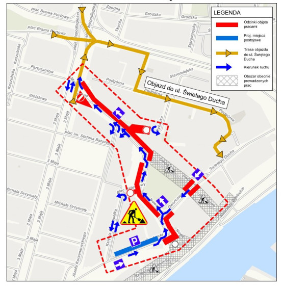 – utrzymanie kierunku ruchu i założeń z obowiązującej czasowej organizacji ruchu wraz z objazdem do ul. Św. Ducha, przeniesienie prac na stronę jezdni, po której obecnie odbywa się ruch pojazdów, przeniesienie ruchu pojazdów (po odpowiednim przygotowaniu nawierzchni) na stronę jezdni na której obecnie prowadzone są prace drogowe;