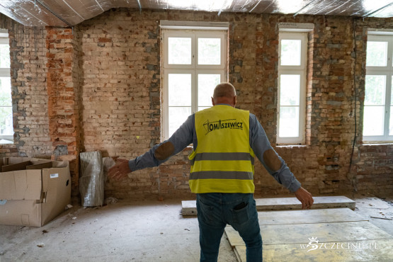 – Budynek się po prostu rozsypywał. Ściany się składały, trzeba było je stemplować, robić ściągi. Od razu musieliśmy zabezpieczyć wszystkie dziury w dachu, przez które wlewała się woda, powiększając jeszcze zniszczenia – opowiada Robert Piórkowski, kierownik budowy.
