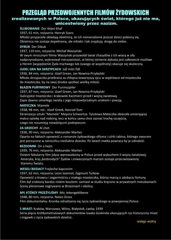 Filmy, które zostaną zaprezentowane w trakcie festiwalu pochodzą z Filmoteki Narodowej. Część z nich posiada listy dialogowe, inne są tylko w jidysz – filmy będą oczywiście tłumaczone na język polski.